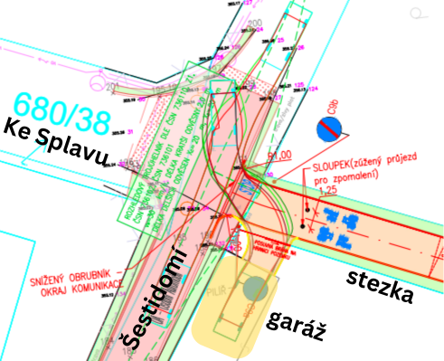 A tak nějak vznikají projekty stezek, které mají na jednom svém konci ještě garáž s vjezdem jako bonus. Čtete správně, přes tu stezku budou sousedé dál zajíždět do garáže, protože jinak se tam nedostanou… Že přes tu garáž je blbě vidět do křižovatky zase třeba někdy jindy.