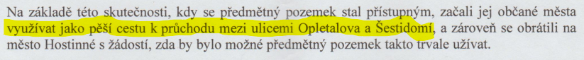 Oproti tomu město pro svůj veřejný záměr argumentuje „několika“ (jejich slova) ústními žádostmi a komunistickým plánem z roku 1949 kde ta cesta je (ač malovaná přes existující zahradu), ale ani tehdejší komunisté ho nerealizovali. Navíc si musí někdo pomáhat trapnou lží, že zahrazený a rozkopaný pozemek začali k průchodu používat lidé během rekonstrukce kanalizace. Ke smůle města, má můj taťka potřebu tyhle věci dokumentovat fotkami, takže níže si obrázek může udělat každý sám, kudy tam ti občané lezli.